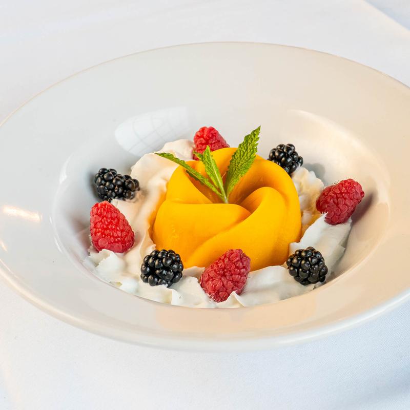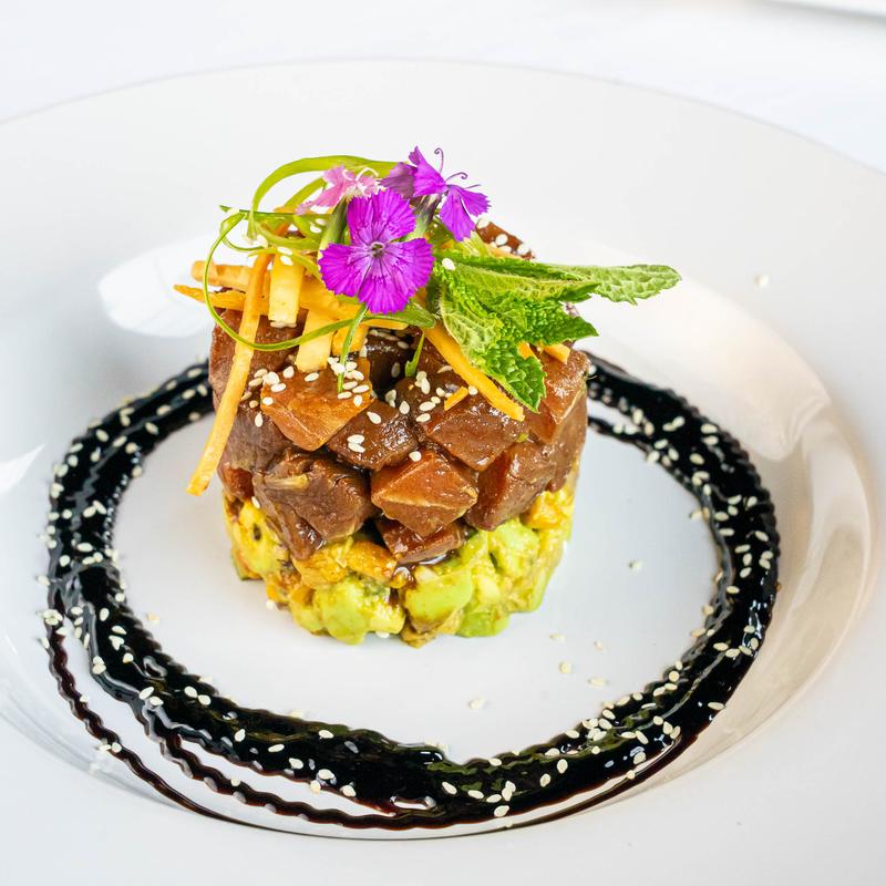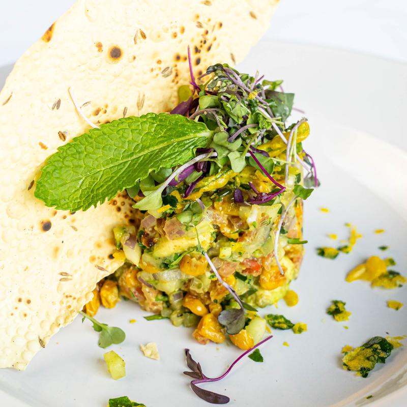 Tartare of sashimi-grade tuna belly, mint, mango, avocado, and tamarind reduction.