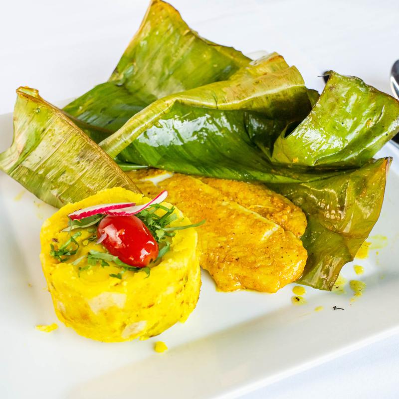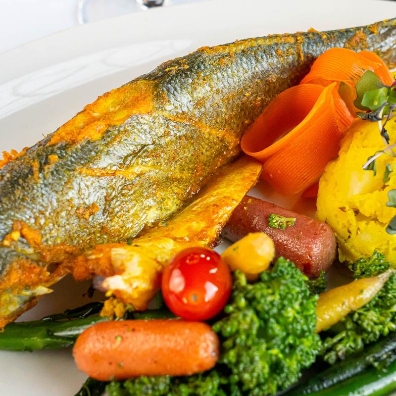 Sea bass marinated in mustard & spice blend.