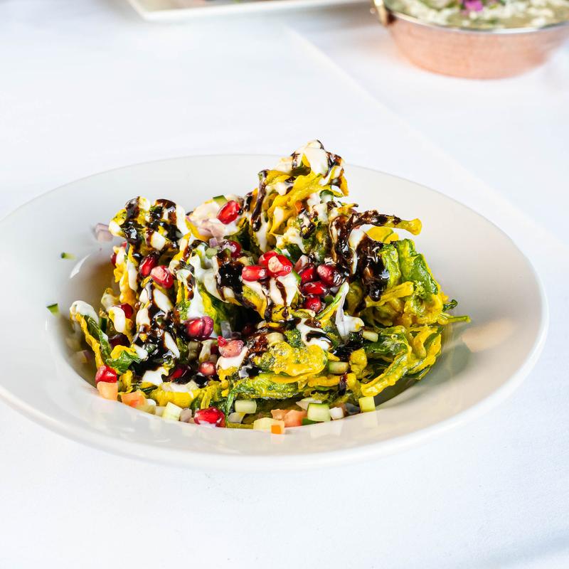 Crunchy spinach with sweet yogurt and pomegranate, and tamarind sauce.