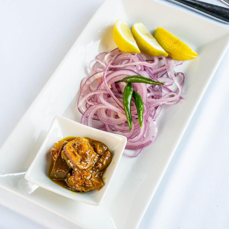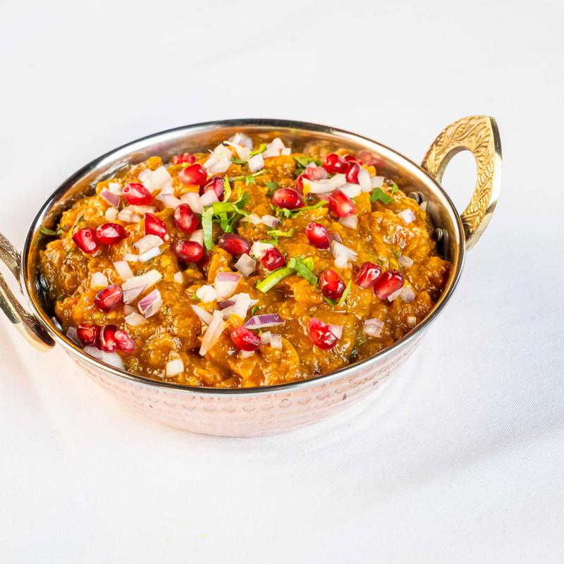Char-grilled eggplant in a rich onion-tomato masala with a hint of jeera &