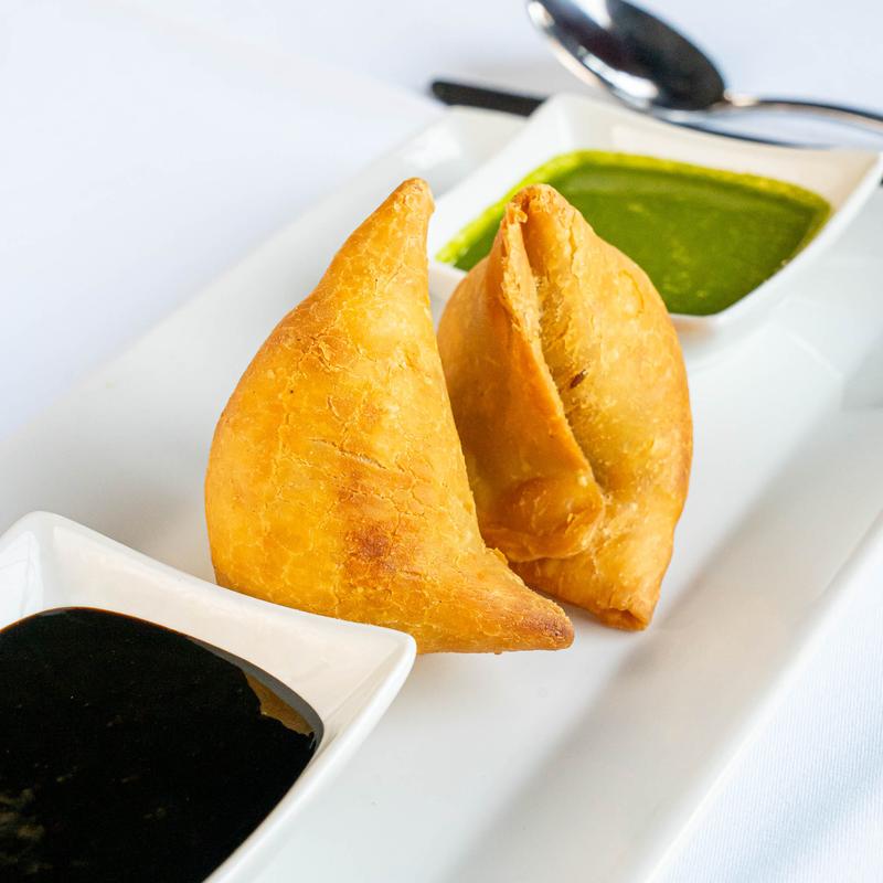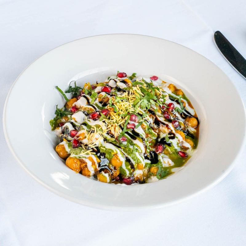 Crisp samosa topped with chana, yogurt, tamarind and mint chutney.