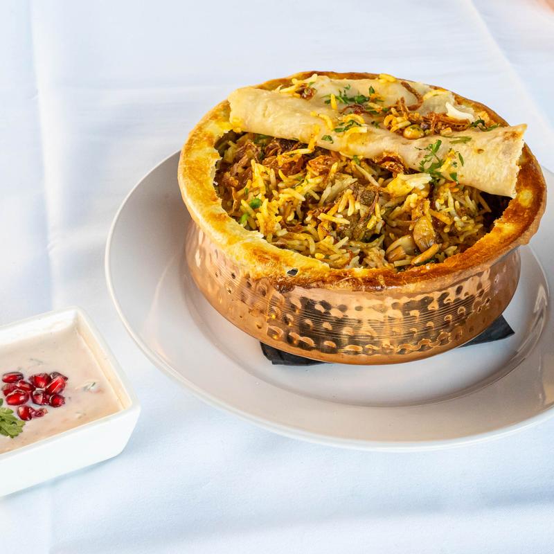 Vegetable $19 | Chicken $22 | Goat $25 | Lamb $24 | Shrimp $24 • A fragrant basmati rice layered with saffron, ghee, dry fruits & royal spices. Served with Raita.