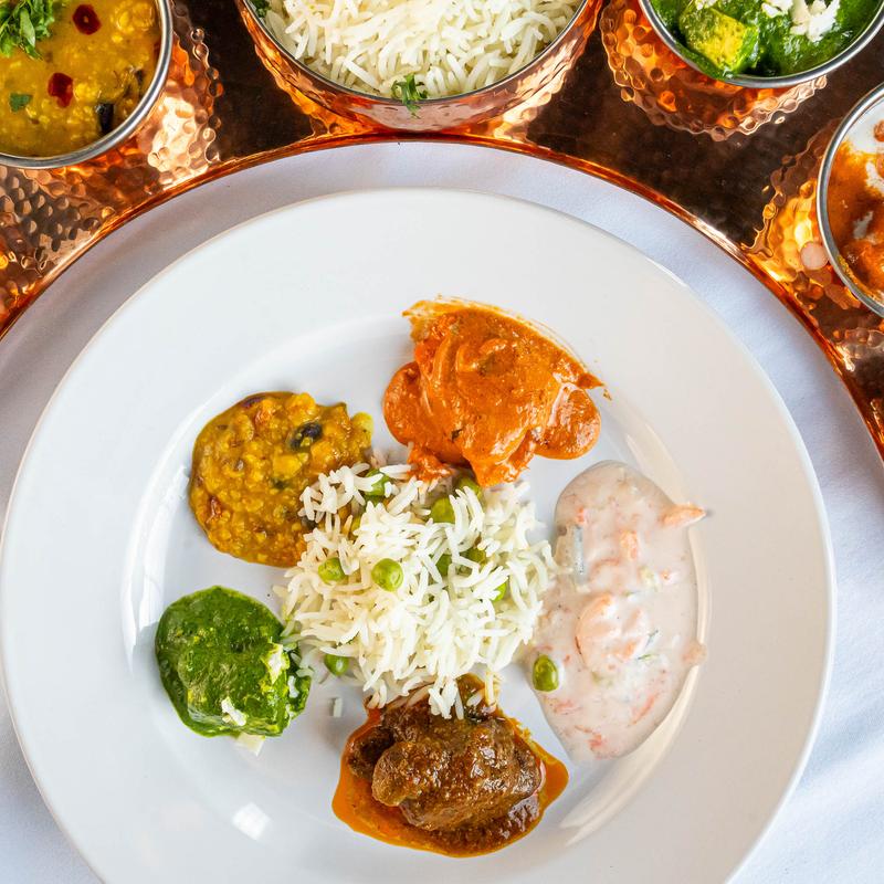 Butter chicken, lamb roganjosh, dal makhani, navrattan korma, rice, raita, served with naan.