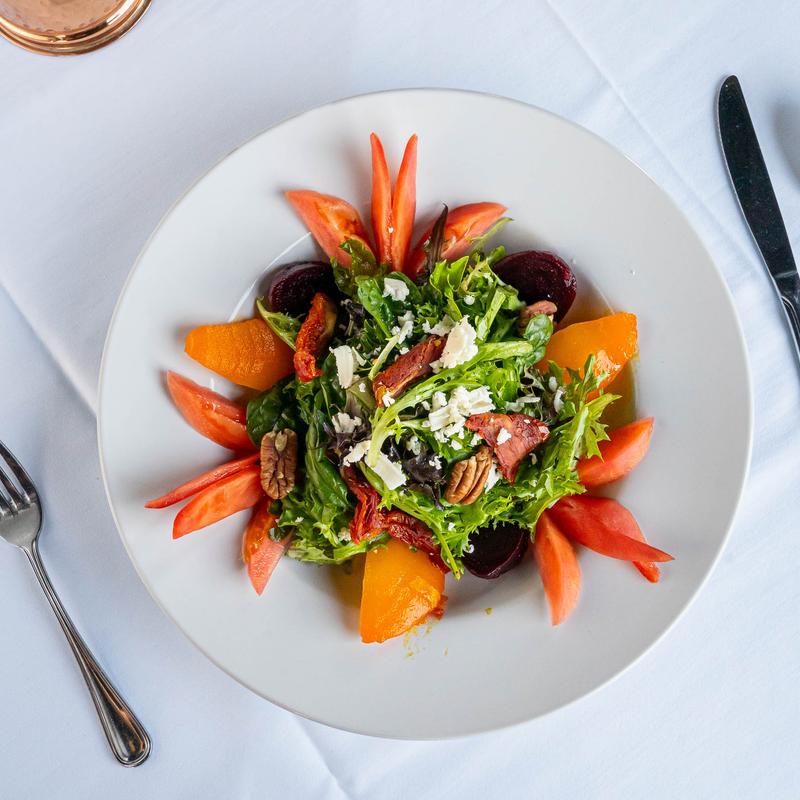 Mixed green, saffron-poached pears, walnut, mandarin, orange vinaigrette.