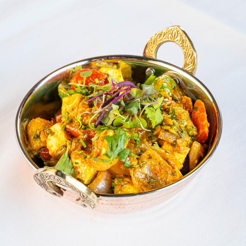 Paneer cubes tossed with bell peppers, onions in a tomato kasoori methi masala.