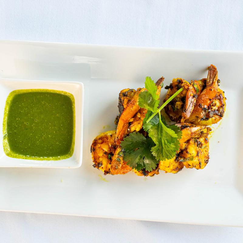 Juicy prawns marinated in a Madras spicy blend of red chili, black pepper, ginger, and curry leaves.
