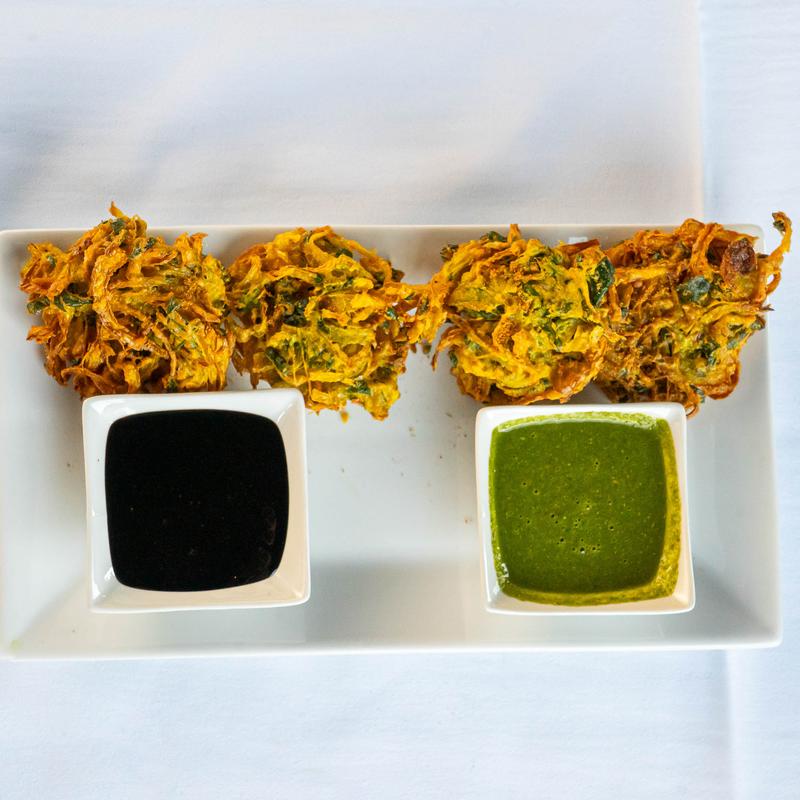 Deep-fried onion fritters with royal masala twist and spinach.